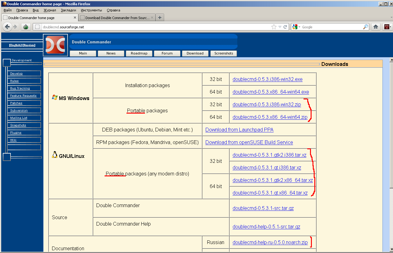 Страница загрузок, где можно скачать архивы портативных версий Windows. Внизу есть ссылка на русифицированную документацию. Для начала закачки следует кликнуть по выбранной ссылке.