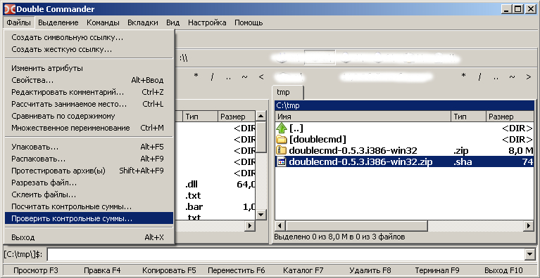Можно, наоборот, рядом с проверяемым файлом создать файл его контрольной суммы указанного выше формата с тем же именем и соответствующим хэш-алгоритму расширением. Пометить (кнопкой пробела) этот файл контрольной суммы и из меню "Файлы"->"Проверить контрольные суммы..." и запустить проверку.