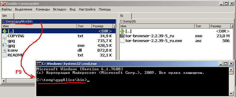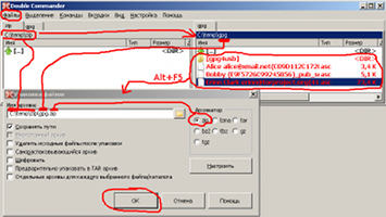 Для упаковки файлов и каталогов достаточно на одной панели выбрать каталог для создания архива, на другой панели выделить требуемые файлы и каталоги (пробелом или Ctrl+A или мышью и т.д.) и нажать Alt+F5 (либо меню "Файлы"->"Упаковать"). После этого в появившемся окне архивации выбрать тип архива, если надо, то уточнить его имя и выставить настройки, затем нажать кнопку "OK".Из Double Commander можно вызвать системную консоль (терминал). Вызывается она нажатием кнопки F9, после чего появляется окно консоли. При этом текущий каталог в консоли соответствует активному в момент вызова каталогу на панели Double Commander, что весьма удобно во многих случаях.