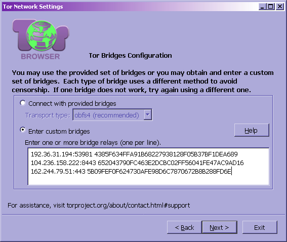 Если готовые мосты не сработали, то выбрать Enter custom bridges (ввод собственных мостов) и вставить в окошко адреса ранее полученных мостов: